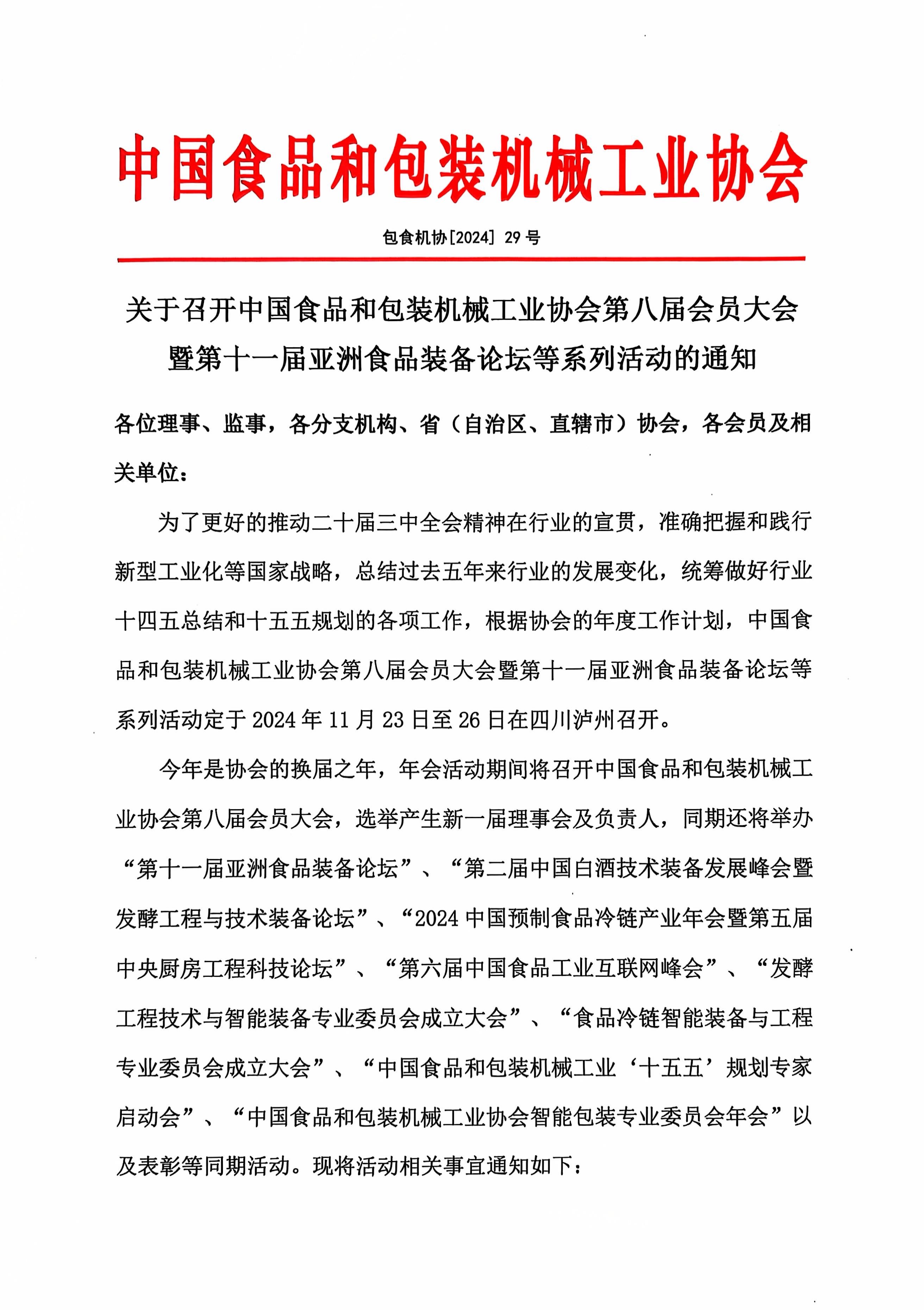 關(guān)于召開(kāi)中國(guó)食品和包裝機(jī)械工業(yè)協(xié)會(huì)第八屆會(huì)員大會(huì)暨第十一屆亞洲食品裝備論壇等系列活動(dòng)的通知